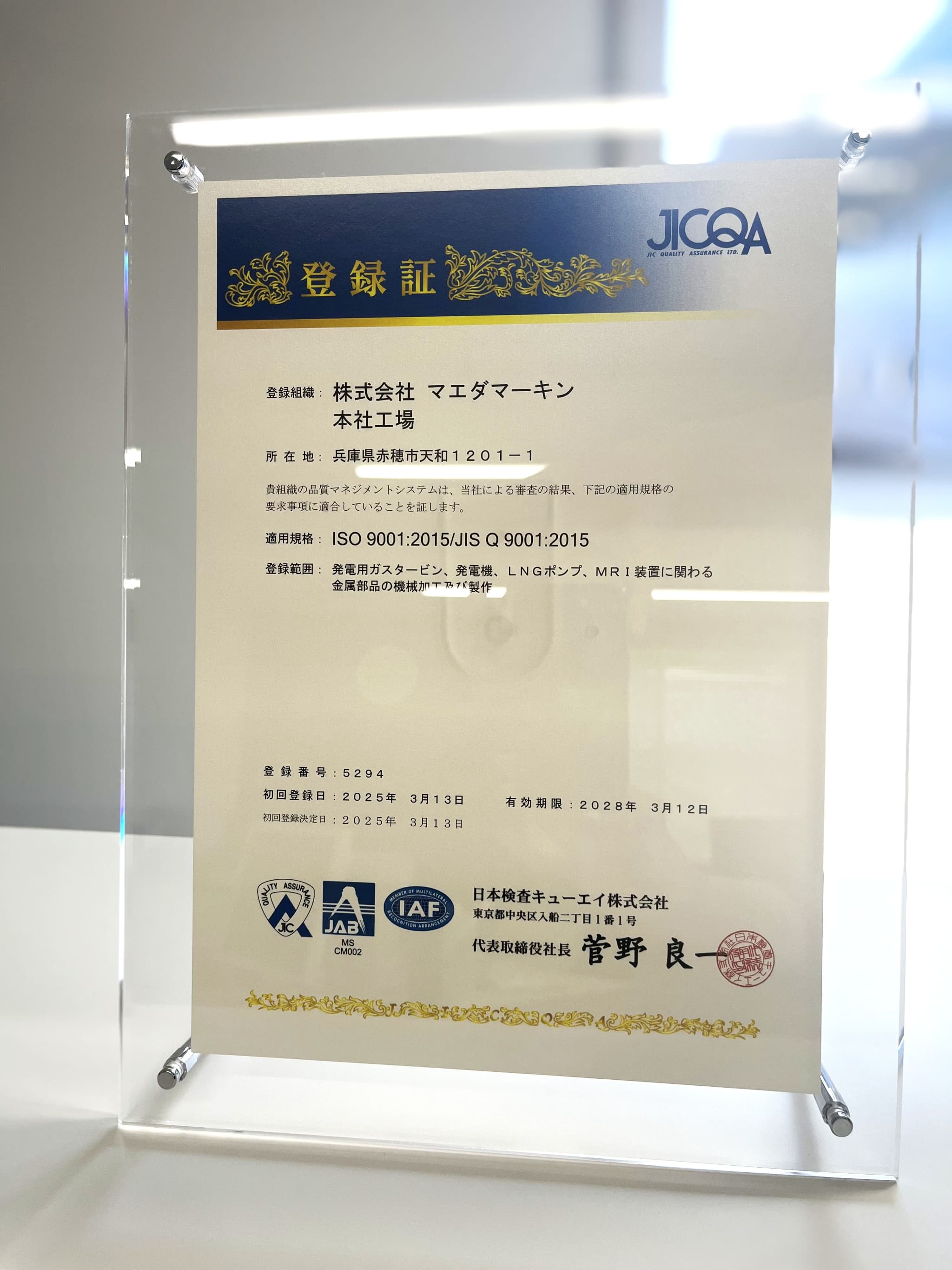 今日、ISOの登録証が届きました!!